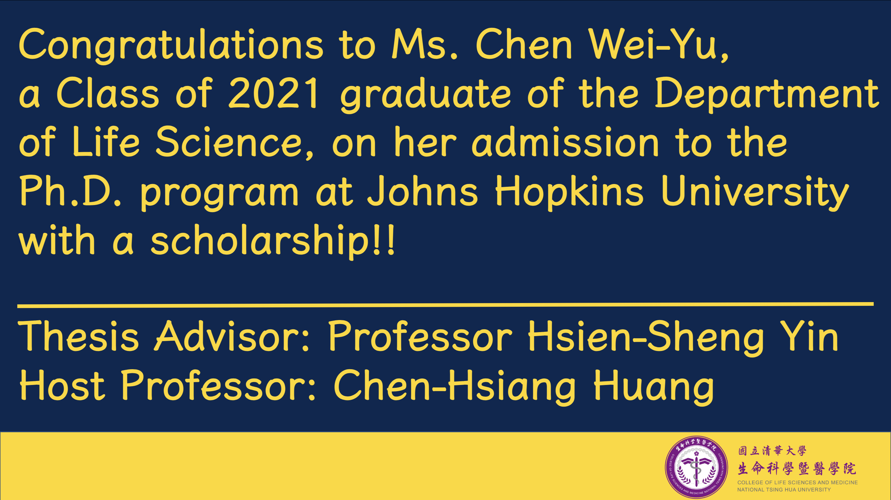 Congratulations to Ms. Chen Wei-Yu on her admission to the Ph.D. program at Johns Hopkins University with a scholarship!